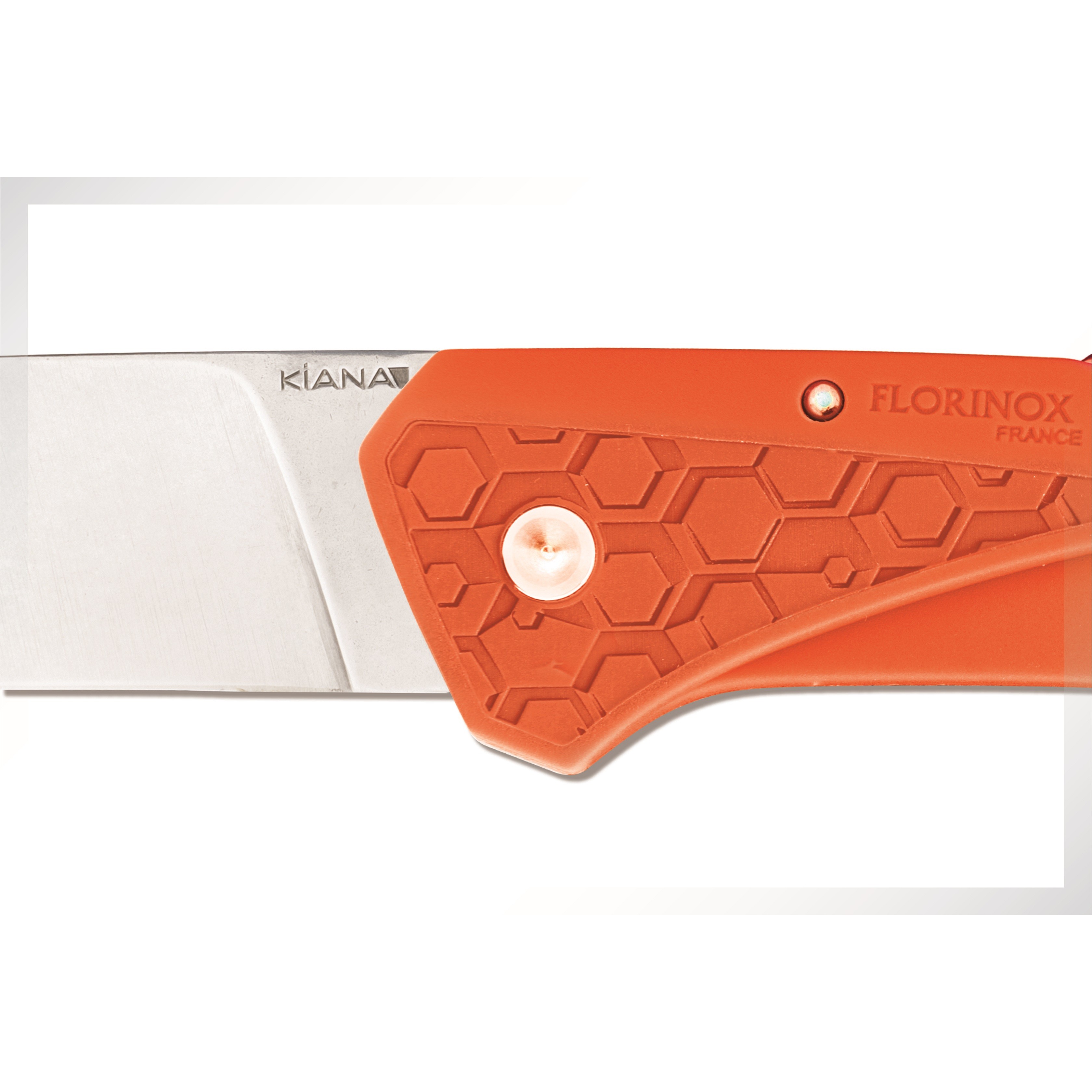 Couteau FLORINOX « KIANA », lame à cran acier X35Cr16N, manche 11 cm polyamide chargé en fibre de verre orange motif « origine ». longueur total ouvert : 200mm longueur lame : 90mm lame lisse...