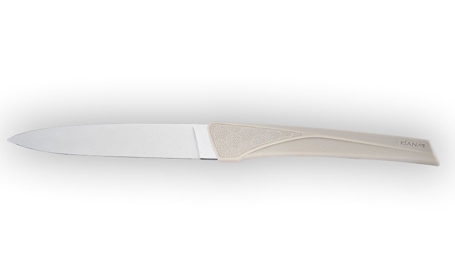 Boîte de 6 couteaux de table Kiana, 23 cm, lame acier X35Cr16N, manche polyamide chargé en fibre de verre beige ficelle. Fabrication française. Garantis lave-vaisselle. Longueur totale : 22,6 cm...