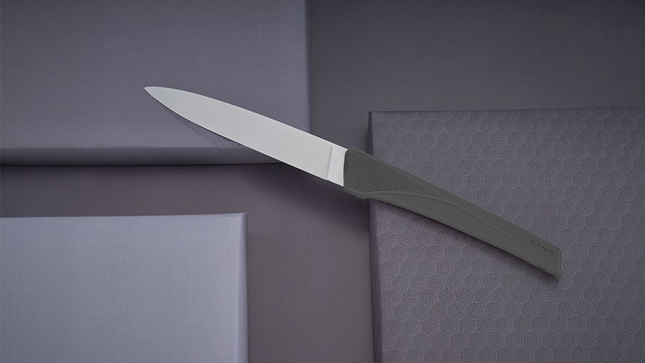 Boîte de 6 couteaux de table Kiana, 23 cm, lame acier X35Cr16N, manche polyamide chargé en fibre de verre gris anthracite. Fabrication française. Garantis lave-vaisselle. Longueur totale : 22,6 cm...