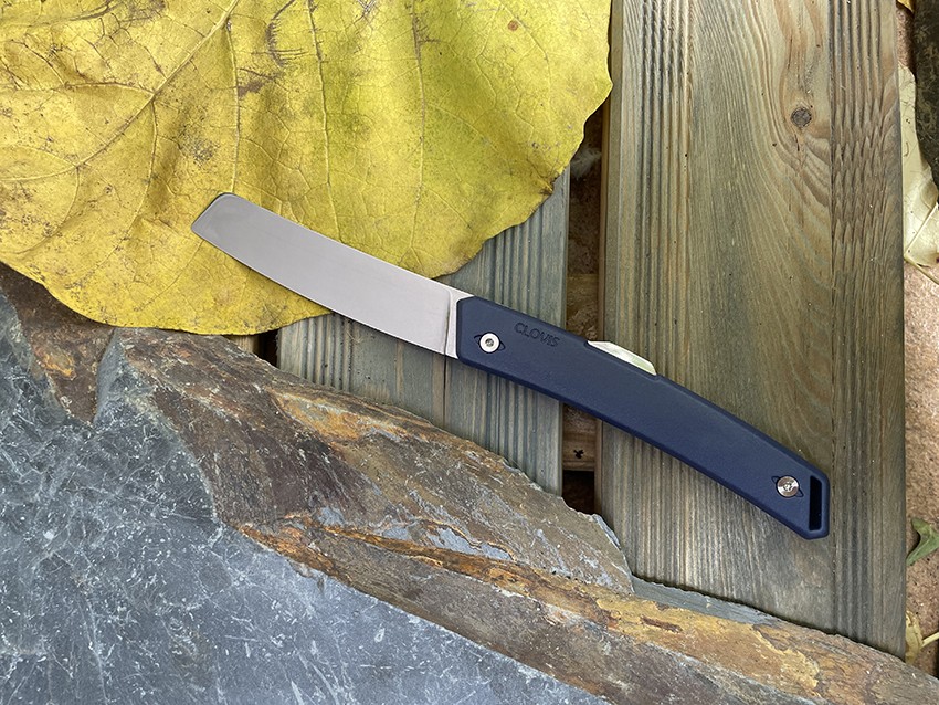 Couteau FLORINOX « CLOVIS », lame sheepfoot à cran (pompe centrale) acier inox X35Cr16N, manche 12 cm polyamide chargé en fibre de verre bleu « CROWN ». CLOVIS, le couteau franc Dimensions et poids...