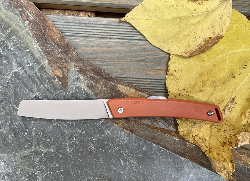 Couteau FLORINOX « CLOVIS », lame sheepfoot à cran (pompe centrale) acier inox X35Cr16N, manche 12 cm polyamide chargé en fibre de verre orange « RUST ». CLOVIS, le couteau franc Dimensions et...