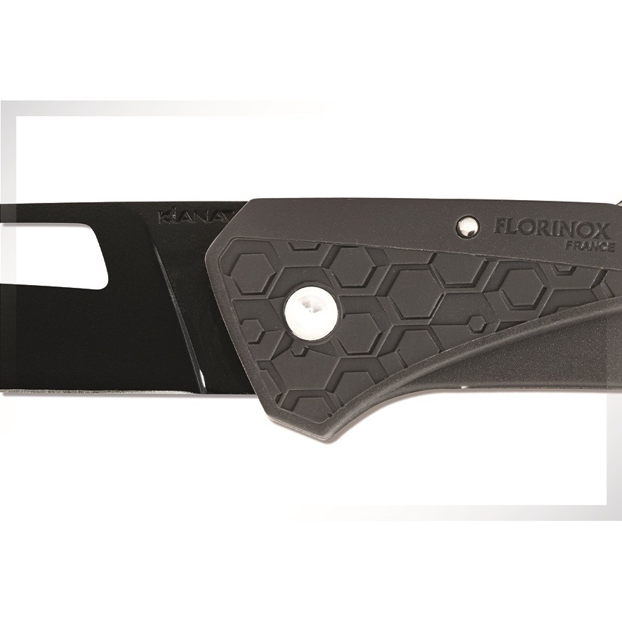 Couteau FLORINOX « KIANA », lame à cran acier X35Cr16N, manche 11 cm polyamide chargé en fibre de verre gris motif « origine », lame noire. longueur total ouvert : 200mm longueur lame : 90mm lame...