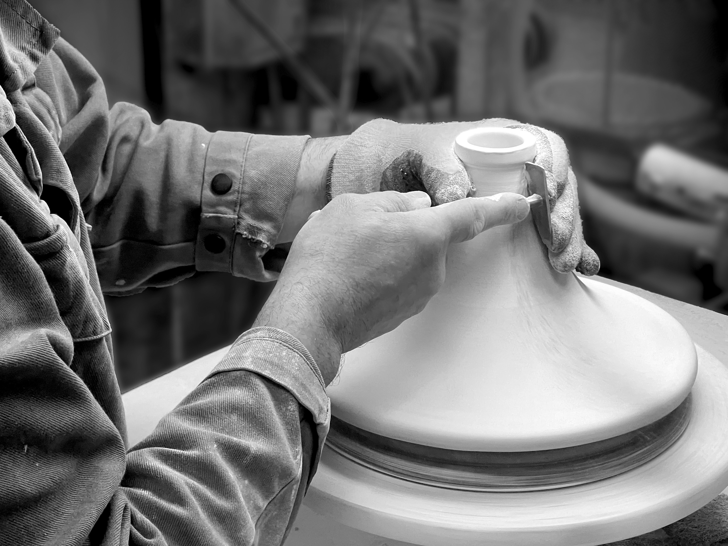 Le couvercle en céramique est quant à lui fabriqué en France dans les ateliers de Peugeot à Languidic en Bretagne. D’abord pressé, il est ensuite ébauché. Après un temps de séchage contrôlé afin d’assurer une certaine consistance de la pièce, l’opération de tournage, essentielle dans la réalisation des cônes de tajines intervient : elle consiste à ôter manuellement l’excès de matière et les aspérités avec un outil spécialement conçu dans les ateliers de Peugeot pour conférer un fini unique à chaque pièce.