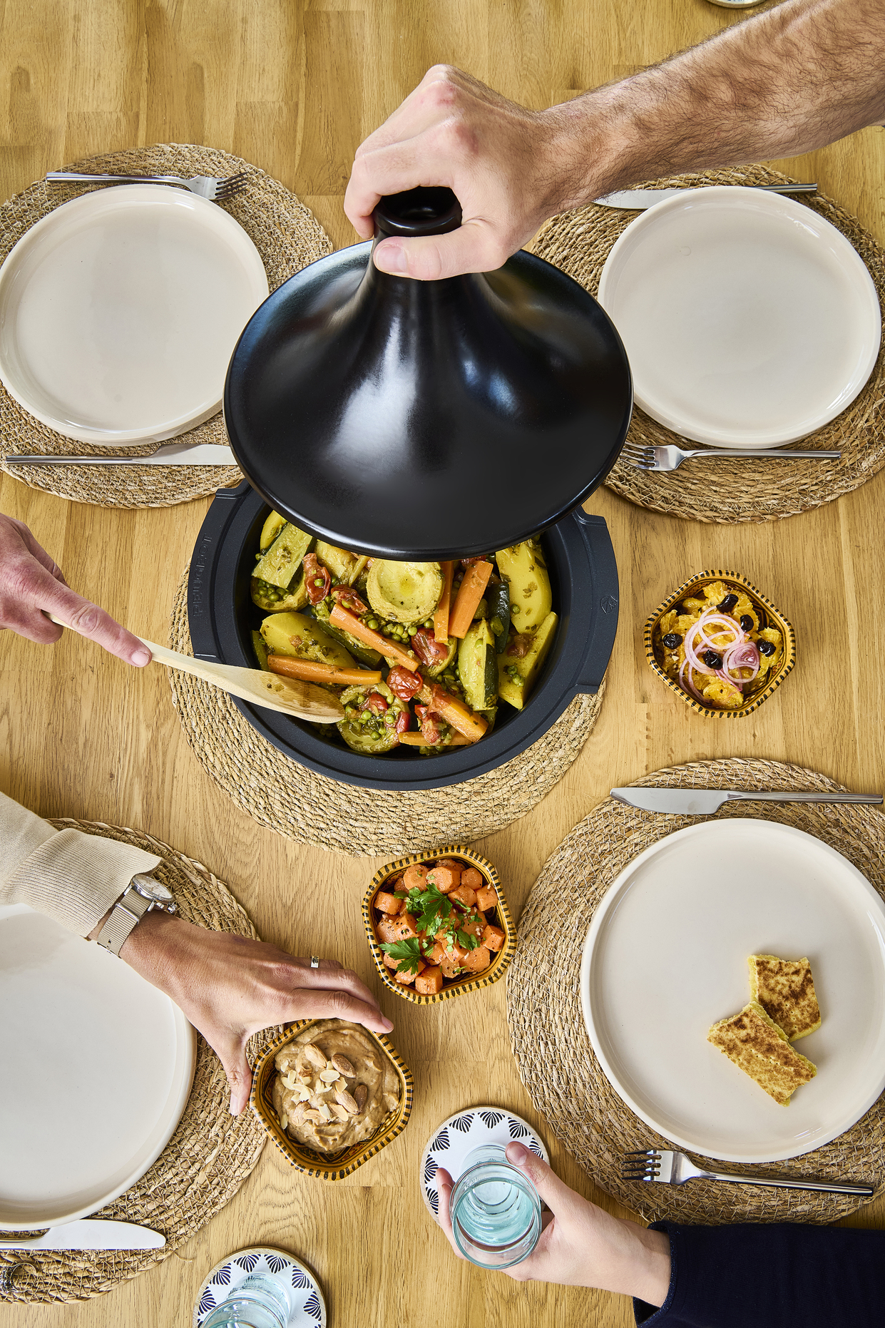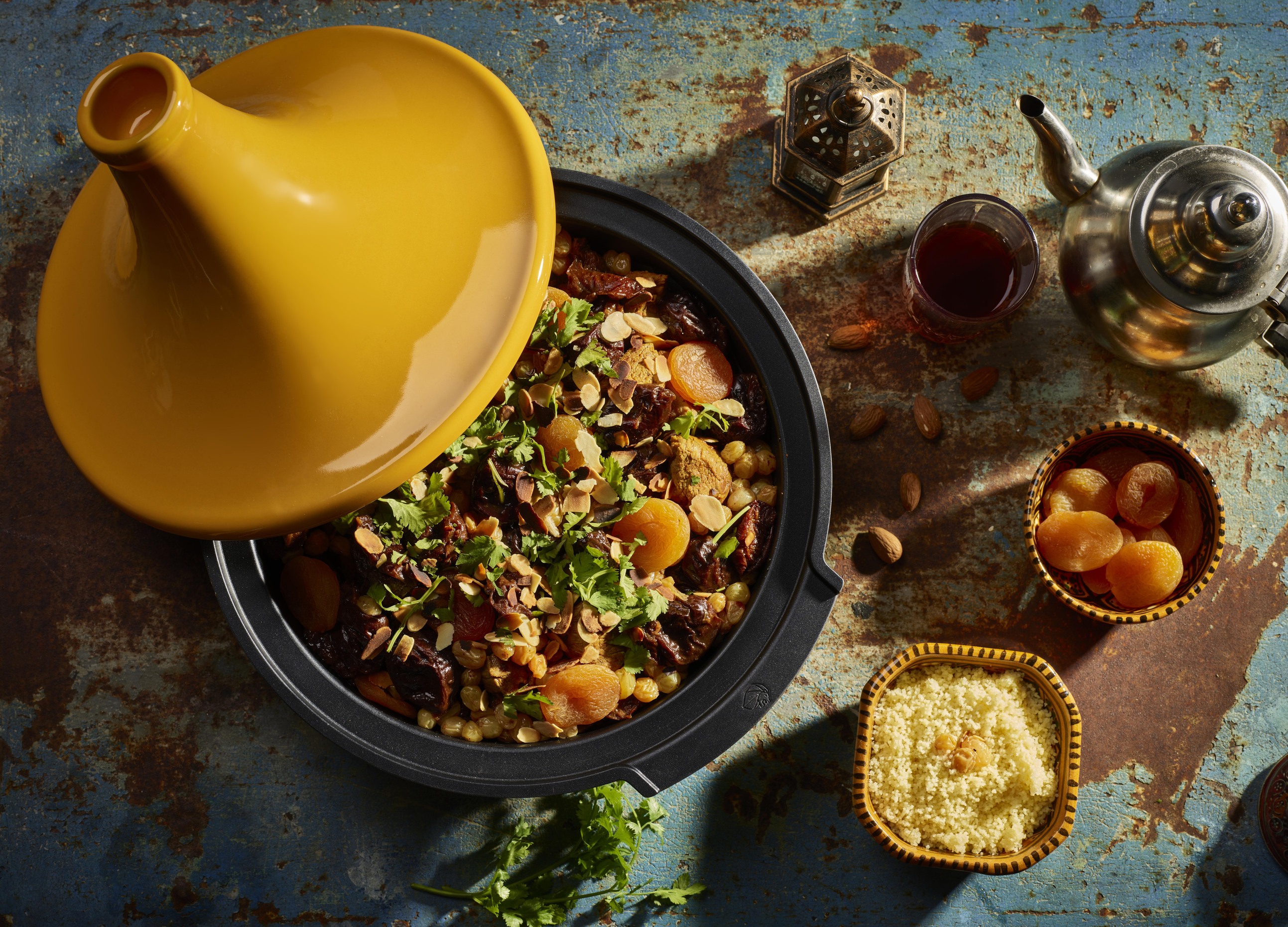 Plat emblématique de la cuisine nord-africaine, le tajine tire son nom de l’ustensile dans lequel il est cuisiné : une base surmontée d’un couvercle conique qui permet une cuisson lente et douce préservant les saveurs et les nutriments. Celui-ci offre une large palette de possibilités culinaire car il est adapté aux poissons, aux viandes et aux légumes. Ainsi, le tajine symbolise la convivialité et le partage.