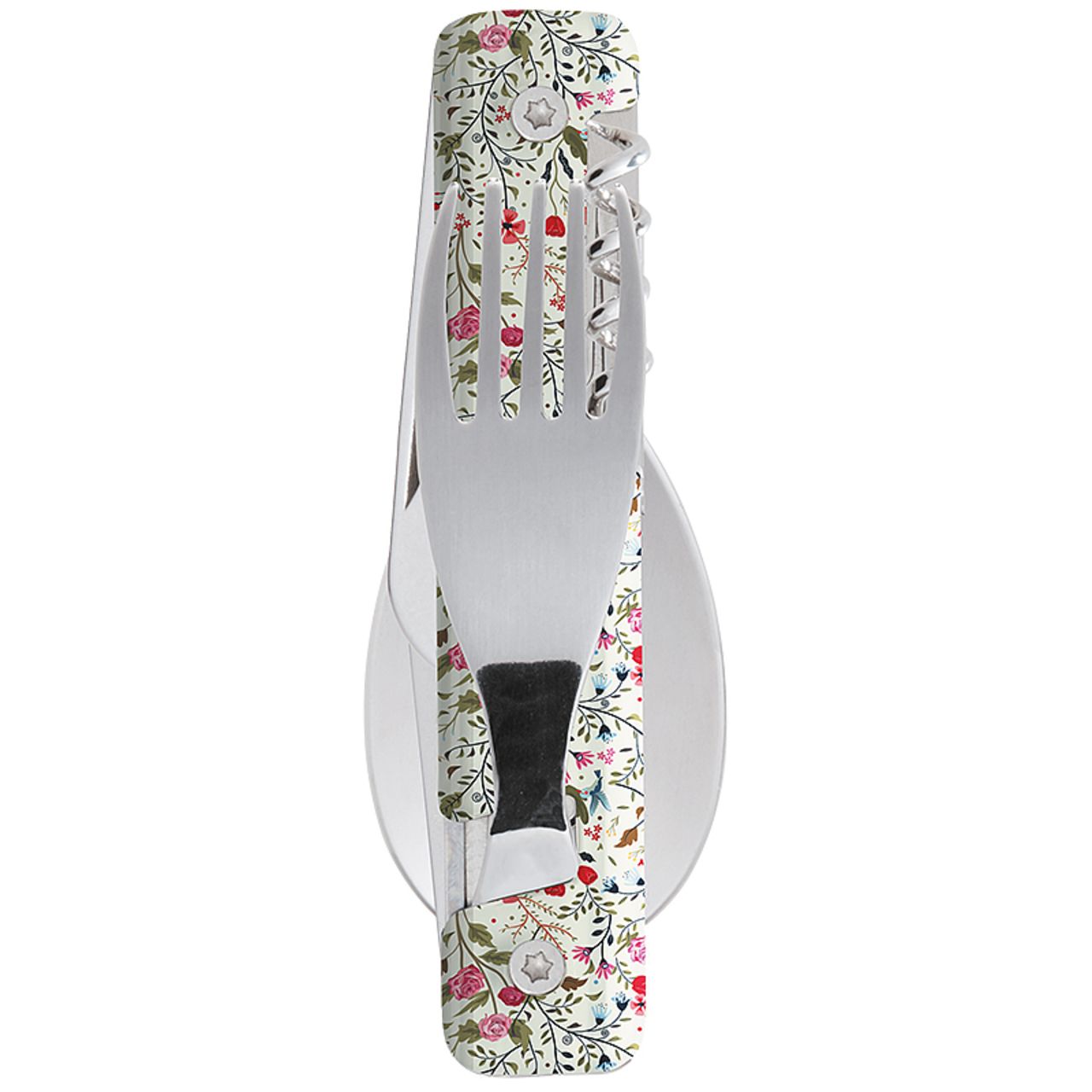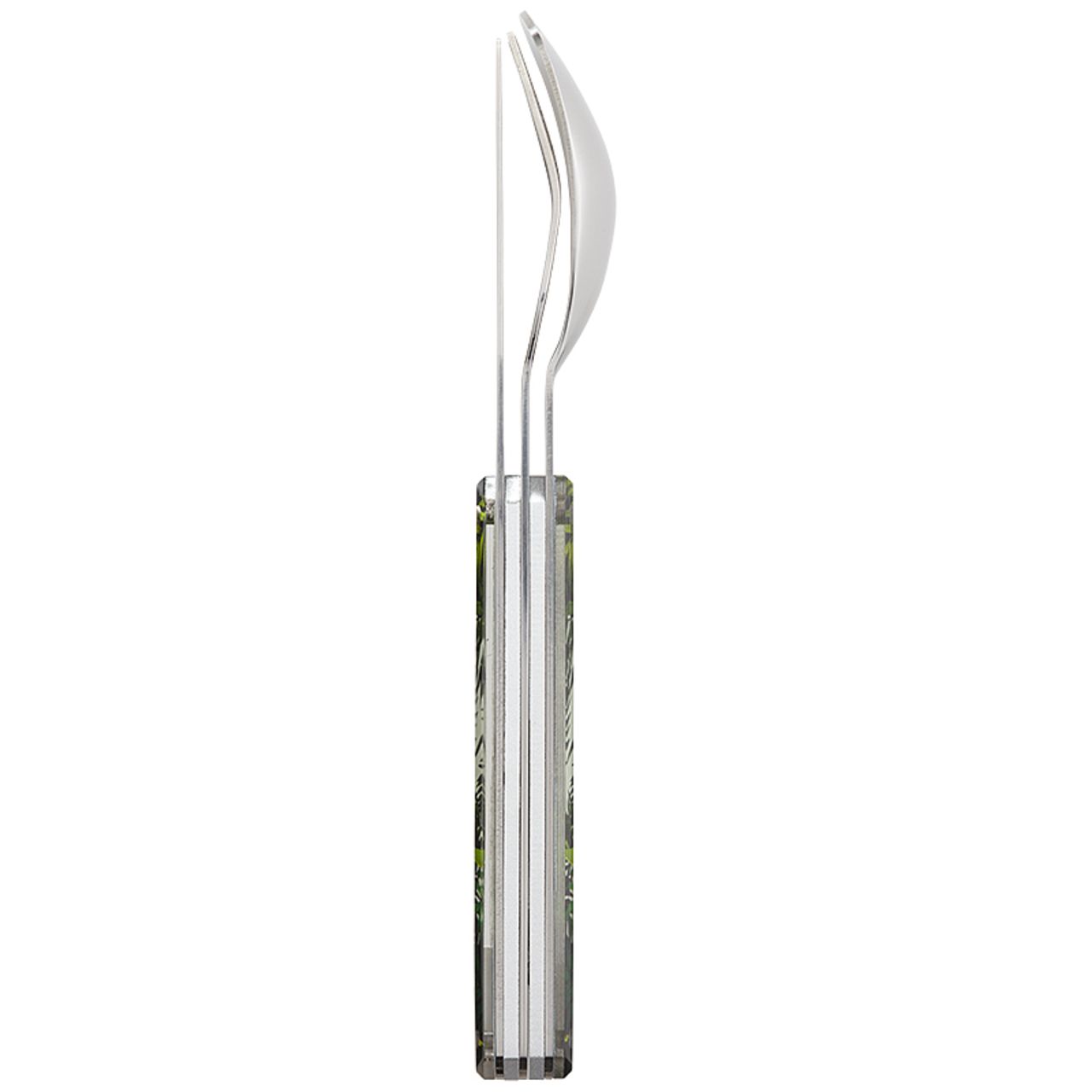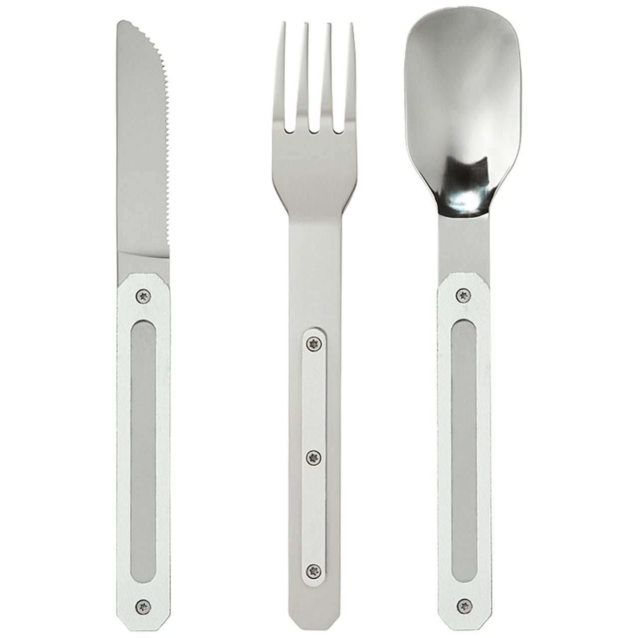 Couverts en acier inoxydable martensitique 2CR14, finition poli miroir. Composé d’une grande cuillère, d’une fourchette 4 dents et d’un couteau à lame micro dentée. Manche en polymère (PC)...