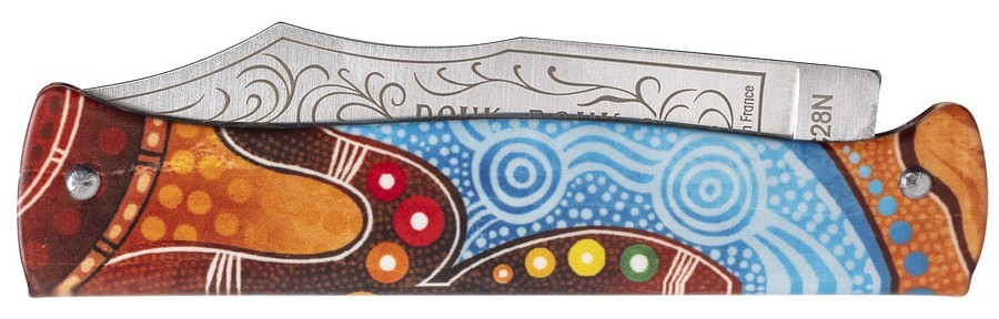 Couteau fermant, Douk-Douk, manche aborigène, acier inoxydable, décoration 3D, artisanat traditionnel, art aborigène, qualité supérieure, collection coutellerie, design unique.