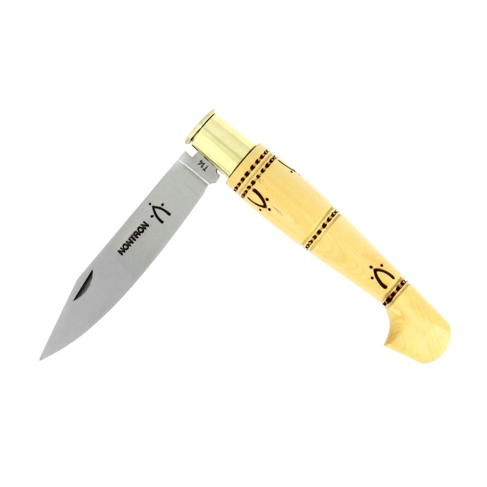 Fabriqué à la main par la Coutellerie Nontronnaise dans le Périgord Vert, ce couteau Nontron perpétue un art séculaire. La pyrogravure signature, le buis noble et la virole forgée témoignent d'une qualité exceptionnelle, idéale pour les amateurs de couteaux pliants authentiques.