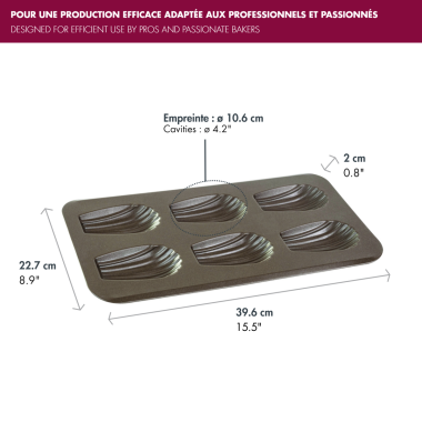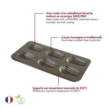 Bord roulé Fer blanc : matériau recyclable Sans BPA ni PFOA Dore parfaitement les madeleines Empreintes permettant une cuisson optimale de la pâte Conductivité thermique...