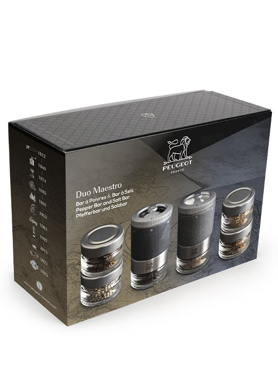 Coffret cadeau duo Maestro Coffret cadeau Maestro pour un embarquement immédiat sur la route des poivres et le sentier des sels. Pour ce duo inédit, Peugeot a réuni son bar à poivres et son bar à...