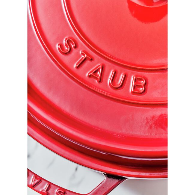 Cette cocotte ronde en fonte émaillée STAUB Cerise de 20cm est adaptée pour 2 personnes, pour préparer des plats mijotés, des rôtis, de la volaille et même du pain ! Compatible tous feux et four, elle peut également s’utiliser sur induction. Véritable savoir-faire authentique de création française, cette cocotte est une pièce unique, issue d’un processus de fabrication traditionnel. Avec son design élaboré et son poids optimisé, son couvercle plat au contour marqué présente d’excellentes propriétés de rétention de l’humidité et assure grâce à ses picots®, un arrosage homogène, une pluie d’arômes, pour des plats qui mijotent longtemps. L’intérieur de cette cocotte est émaillé noir mat, la marque de fabrique STAUB. Cet émail de qualité supérieure permet d’obtenir une meilleure résistance aux rayures et facilite l’entretien. Il possède les propriétés idéales pour saisir, rôtir et caraméliser les aliments. Née en Alsace, la cocotte STAUB a su traverser le temps et les frontières. Préférée aussi bien par les amateurs que les grands chefs, elle passe aisément de la cuisine à la table. Quel que soit le plat que vous concoctez, avec la Cocotte STAUB vous avez l’assurance de conserver toute l’intensité et les saveurs, la viande restera tendre et les légumes moelleux. Composée de fonte, un alliage de fer riche en carbone, un des matériaux qui retiennent le mieux la chaleur, la diffuse lentement et la redistribue de manière parfaitement homogène. Une fois la fonte suffisamment chaude, ses propriétés de rétention de la chaleur permettent de réduire le feu au minimum, afin de laisser mijoter doucement les plats. La fonte conserve également le froid : la cocotte à température ambiante peut être placée au réfrigérateur avant de servir afin de rester froide une fois à table.